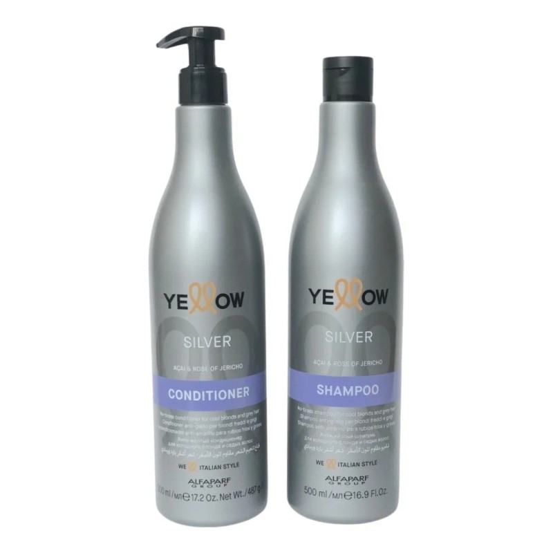 💇♀️ El Kit Yellow Silver Shampoo + Acondicionador (500 ml cada uno) es la solución profesional para mantener el tono perfecto en cabellos rubios, grises, platinados o con canas. Su fórmula contiene pigmentos violetas que neutralizan los tonos amarillos no deseados, devolviendo al cabello un aspecto más frío, brillante y saludable.