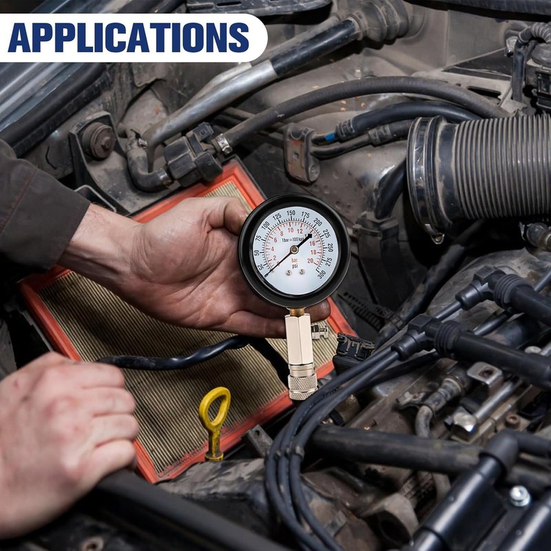 • 【Professionelles Öldruckmessgerät】Unser Kompressionstester-Set ist ein unverzichtbares Werkzeug, um den Druck auf den Zylinder sowohl bei Benzin- als auch Dieselmotoren präzise zu messen und eignet sich ausgezeichnet für Kfz, Motorräder und andere Fahrzeuge.