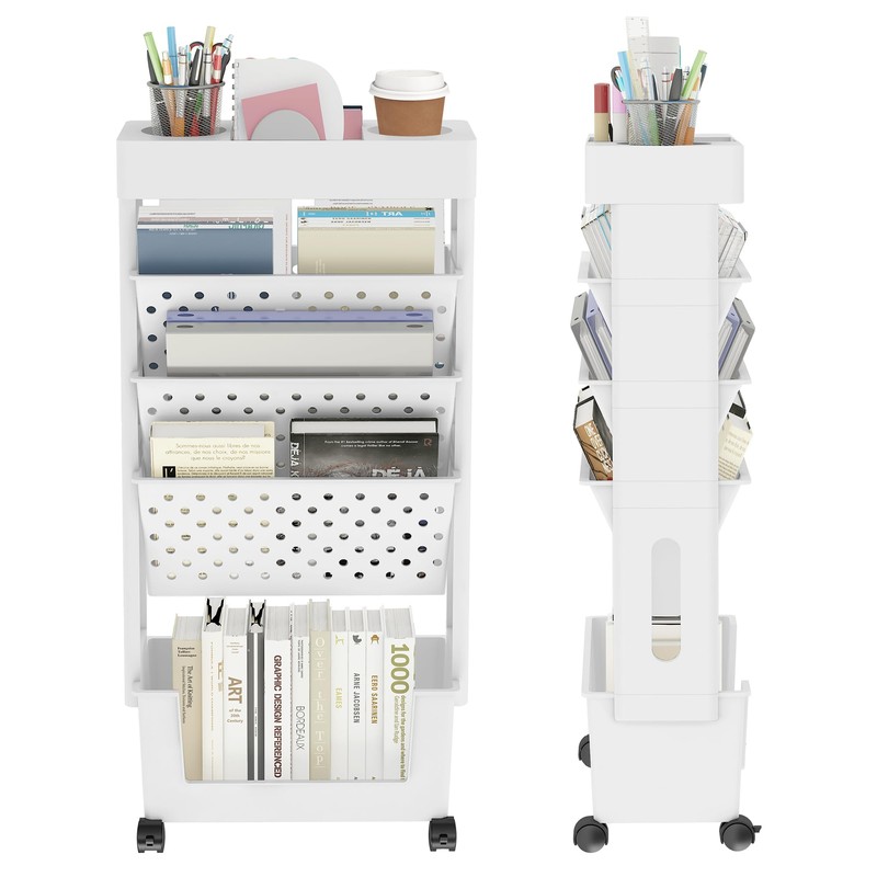 YEMUNY 5 Tier Rolling Utility Cart Multi-Functional Movable Storage Book Shelves with Lockable Casters for Study Office Kitchen Classroom, White