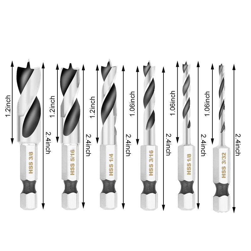 • ⚙ Stubby Drill Bit Set Content: This wood stubby short drill bit set includes 6 pieces of point drill bits in sizes: 3/32" 1/8" 3/16" 1/4" 5/16" 3/8", which meet your different drilling requirement.Total length of these drill bits: 2.4inch /60mm. They are neatly arranged in a plastic box for your convenience and storage.