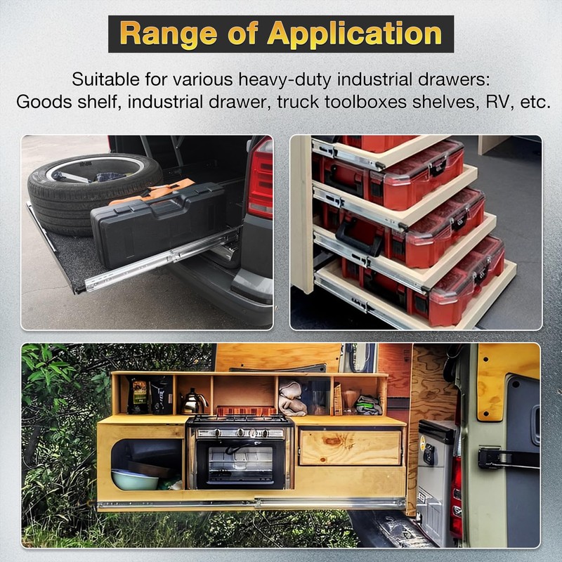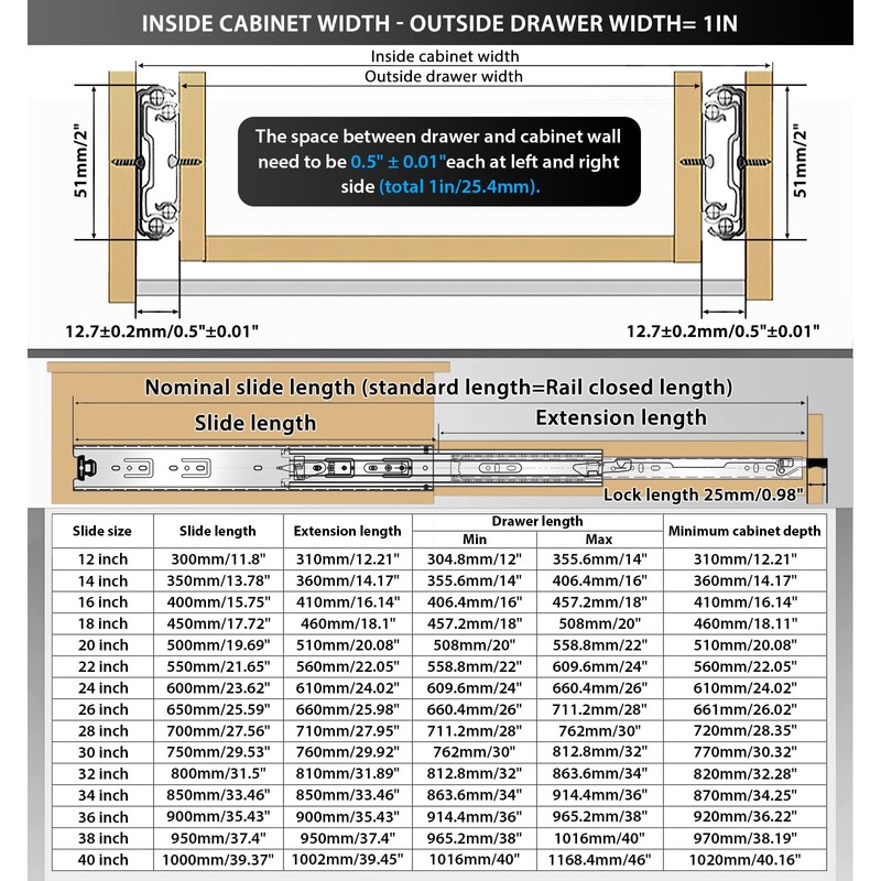 - 【3-fold full extension】 Slides width:2"(50mm)- length: 30" (750mm)--Fully extended length: 60"(1510mm), “The 3-fold full extension”enable the slides to fully extend, so the drawer can be pulled out completely, which allows for the entire drawer's storage to be accessed easily; Application range:Goods shelf, Cabinets, Industry-used drawer, RV, Truck, Vending machine, etc.