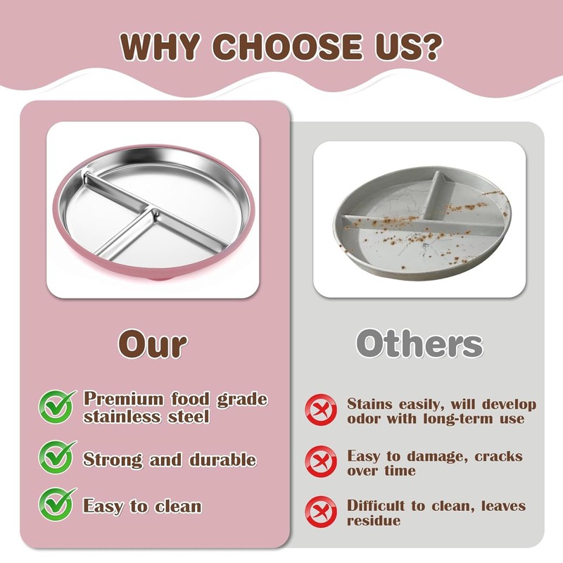- Safe and pure stainless steel: the smooth, BPA-free, lead-free stainless steel surface of this baby plate with suction cup does not absorb fats, soaps or odours. Smash and heat resistant, this stainless steel children's plate is the perfect alternative to fragile porcelain or plastic. Available to withstand drops and last for years, it is ideal for baby plates with suction cup sets that