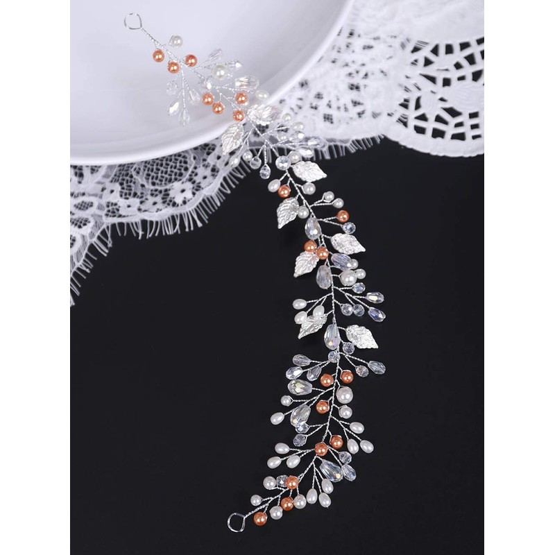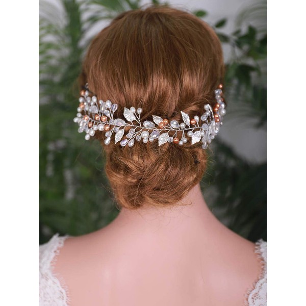 YERTTER Handmade Bridal Hair Vine Leaf Pearl Headbands for Bridal Wedding Party Beads Hair Vine Bridal Hair Accessories for Women and Bride (Silver)
