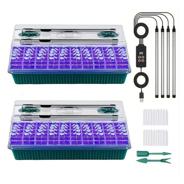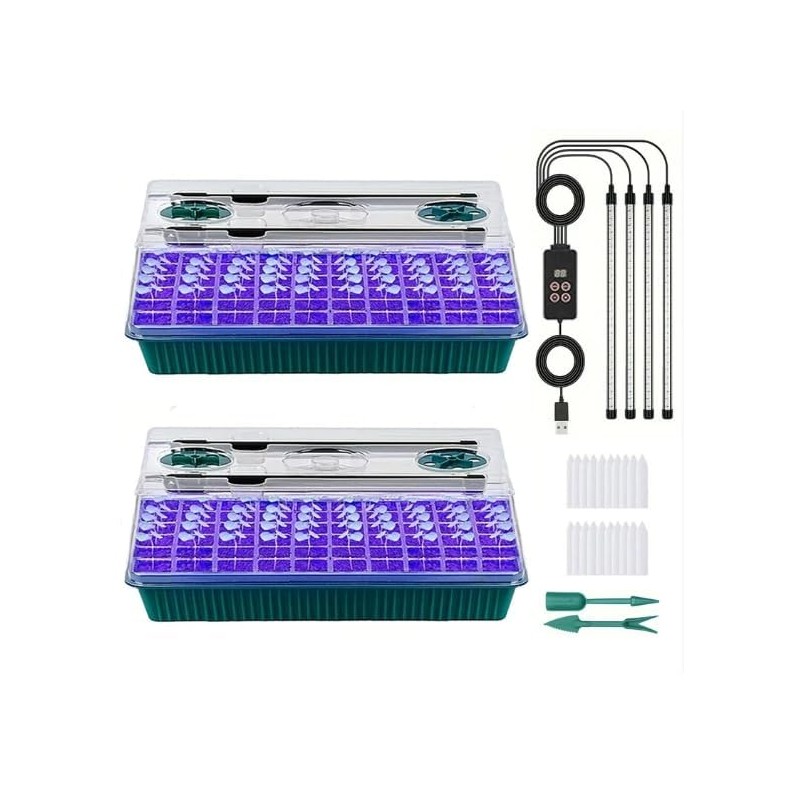 - Complete All-in-One Seed Starter Kit: Includes 2×60-cell trays, 2 humidity domes, 4 vents, 2 base trays, 2 capillary mats, 2 plant stands, 4 LED strips with controller & adapter, 20 plant labels, and 2 garden tools. A perfect gift for plant lovers or larger indoor growing projects.
