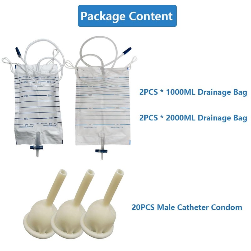 Product packaging20pcs Condom+2pcs 1000 ml Urine Bag+2pcs 2000ml Drainage Bag