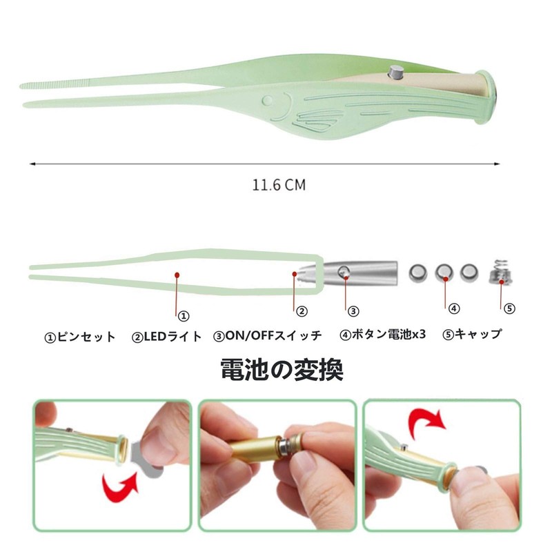 - LEDライト付きの耳掃除用ピンセット。サイズ:11×1.5×1.5cm ,色:ミントグリーン, 素材:ステンレス。電池付き。