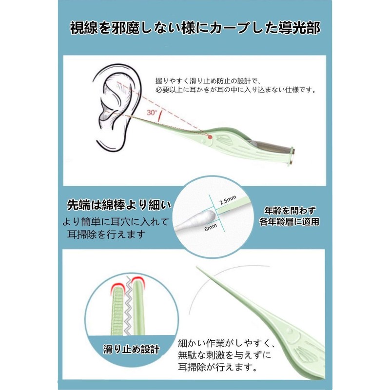- 視線を邪魔しない様にカーブした導光部と握りやすく滑り止め防止の設計で、必要以上に耳かきが耳の中に入り込まない仕様です。
