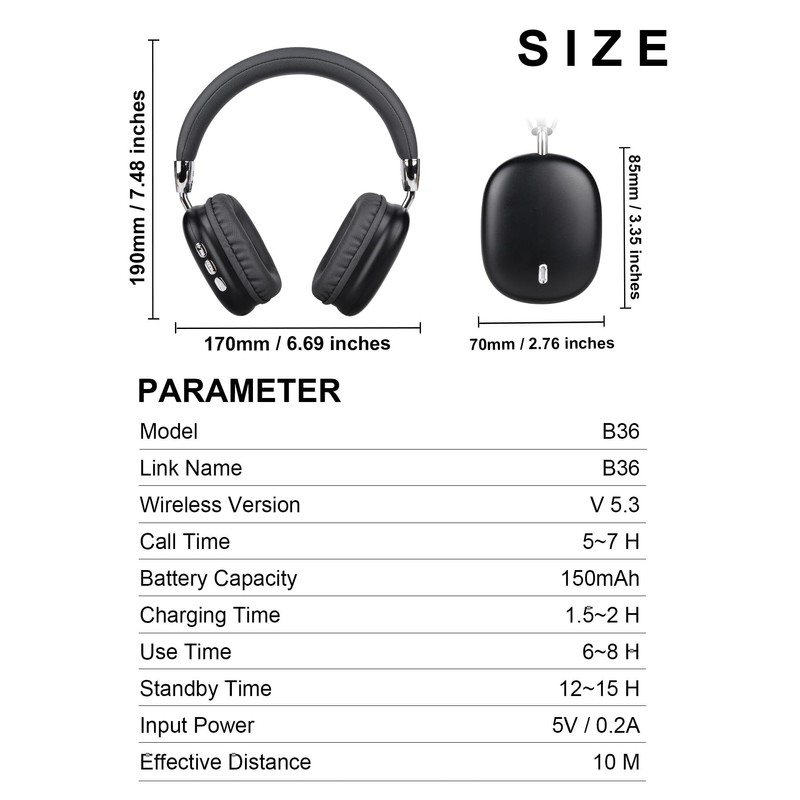 - B36 noise cancelling headphones has adjustable functions that can adjust the comfort of wearing according to the size of one's own head. Wireless headphones suitable for most people to wear.he adjustable headband and tilt rotating earmuffs can find your perfect fit, making them ideal for all day comfort.
