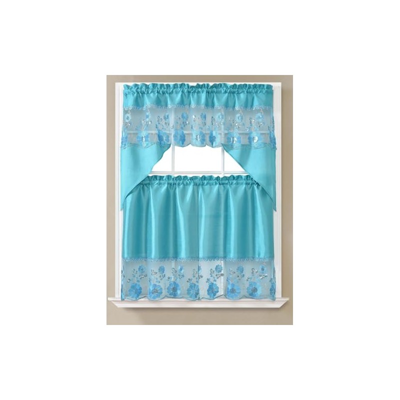 YHSF 3 Piece Rod Pocket Embroidered Kitchen Window Curtain Set 2 Tiers and 1 Valance Included (Turquoise Flower)