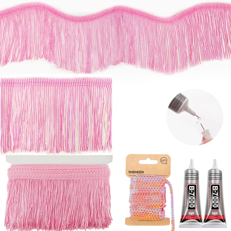 Yhsheen Pink Fringe, 5 Yards X 4 Inch Fringe Trim with B7000 Glue, Tassels Trim for Crafts, Polyester Fibre Sewing Fringe Trim(Pink)
