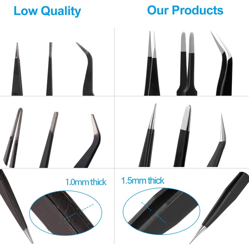 - 【 Antistatic, Resistant and Non Corrosive 】 --- Precision electronics tweezers Set is made of durable stainless steel with anti-static paint on the surface and is resistant to most acids and other corrosive substances. You will like these ESD precision tweezers !