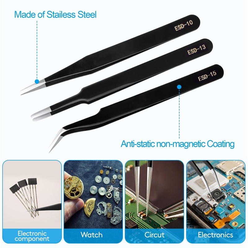 - 【 9PCS Tweezers Set. Meet Your Different Needs 】 --- This electronics ESD tweezers set has 9PCS different tweezers to meet your different needs. These tweezer can be widely applied to PCB, repairing of watches, crafts, jewelry, electronics, laboratory work and so on