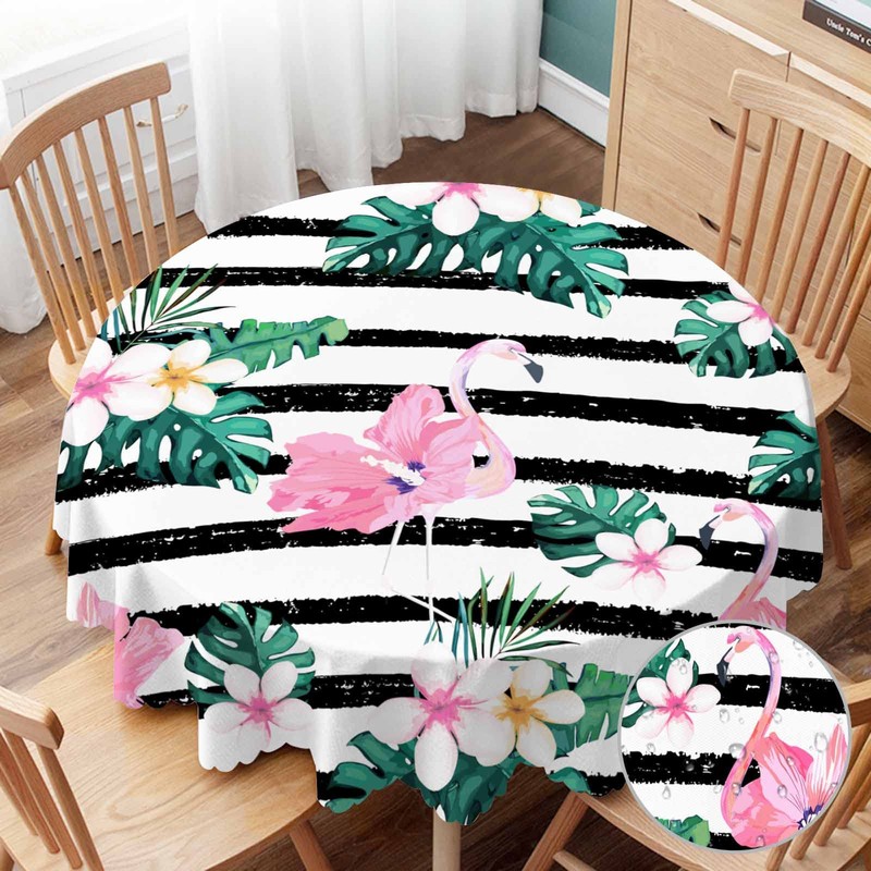 Yibeas Table Cloth Flamingo Round Tablecloth 60 inch Birds Pink Flamingos Flower Green Palm Leaves in Black White Stripes Tablecloths for Round Tables Small Round Tablecloth Table Cover for Outdoor