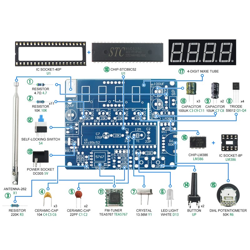 - This soldering practice kit includes welding exercise board, 18 kinds of, 47 pieces of electronic plug-in components.