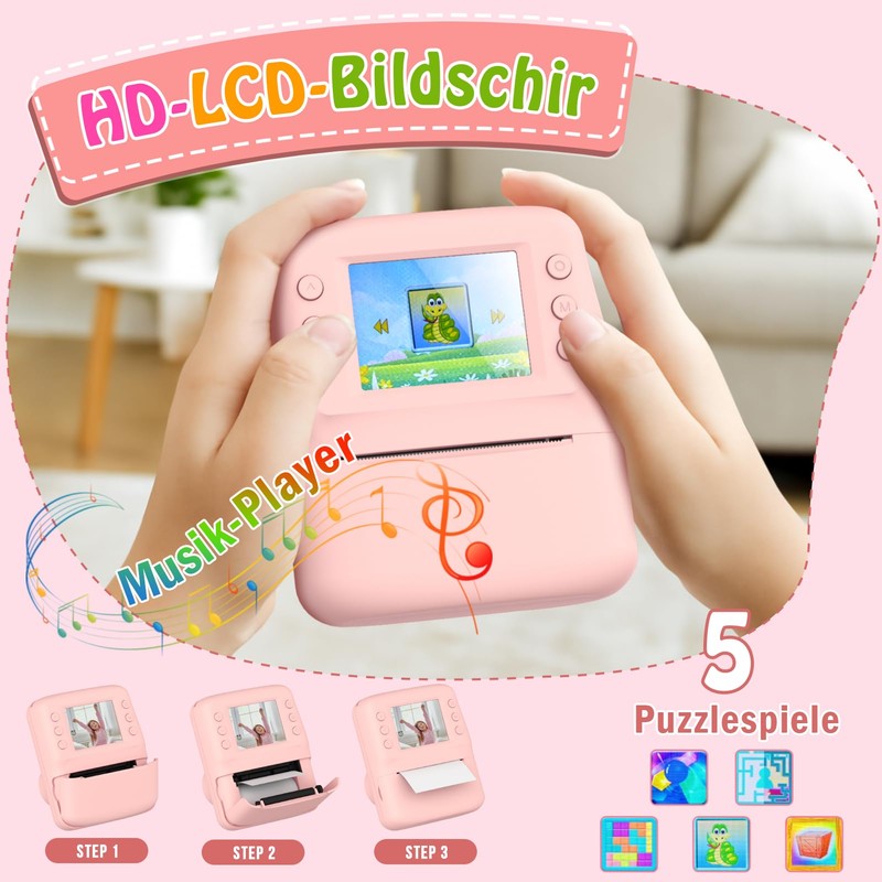 【Upgraded Instant Camera for Kids】: The 5 in 1 instant camera for kids is an upgraded version and is suitable for children from 3 to 10 years old. It offers 5 functions in one camera: color photo shooting, black and white instant image, 1080p video recording, music player and 5 puzzle games. A great toy for boys and girls from 3 to 10 years.