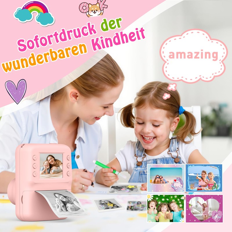 - 【GREAT FIRST CAMERA FOR TODDLES】: The instant camera requires no ink and adopts advanced child safe printing technology. So your children can print their favourite photos in seconds without having to wait long! 3 rolls of printing paper are included. You can choose between two print modes - grayscale and dot printing - as well as 7 different print densities (1-7) for different results. Thanks to the long battery life, you can take photos for 6 hours or record videos for 3.5 hours on a full charge.