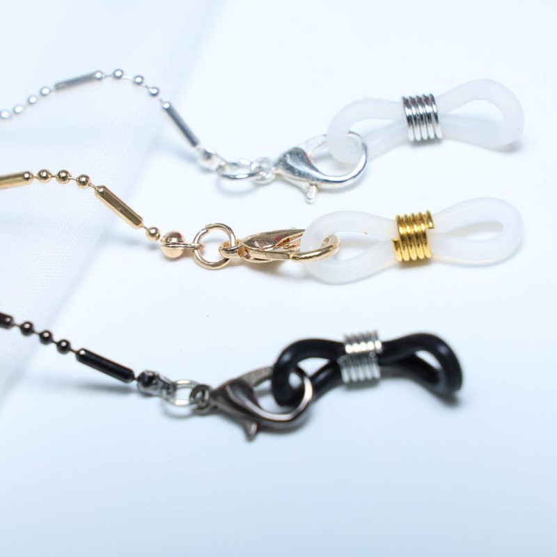- This eyeglass chain both ends have adjustable loops with metal coils. Easy to install and remove. The anti-slip silica gel buckles can prevent the glasses falling down. Will never lose your glasses again.
