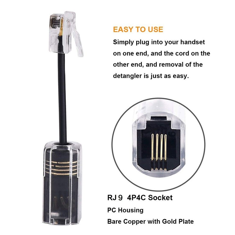 - Handset Cord Untanglers:Telephone cable detangler applies to family or office fixed-line telephones which work with a standard RJ9 telephone line, 4P4C Gague handset coiled cord, such as Cisco phones. But NOT suitable for VOIP phone and RJ45 modular plug