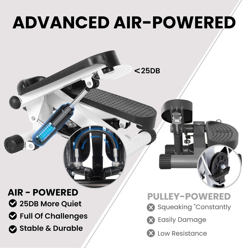 Ergonomic Design & Super Quiet Design: Compared with other stepper machines, the mini stepper simulates normal walking (up and down) to avoid deformation of the legs or knee sprain, safer and healthier. The bottom of the workout stepper is equipped with a 3D shock-absorbing pad, and it is powered by air not a pulley. While you are stepping on it, its sound is so weak, ensuring a quiet workout that does not disturb your family.
