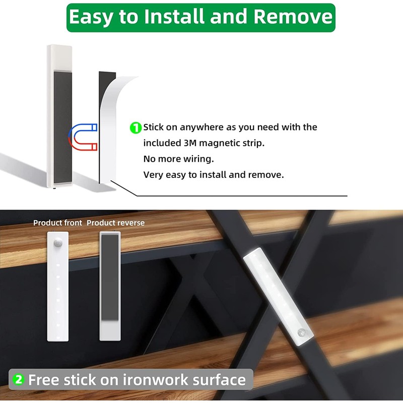 - 2 INSTALLATION METHODSUnder cupboard kitchen light is easy to install, one is a magnet built in the back of the cabinet light, which can be directly adsorbed on any iron surface. The other is to remove the double-sided tape and use the attached magnetic strip to stick it anywhere you want to install the light, then stick the LED cabinet light induction light on the magnetic strip, you can stick it anywhere.