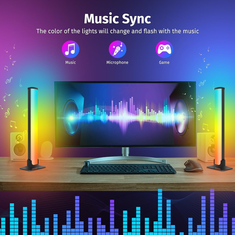 - Sync with music: This LED smart TV backlight light bar has a built-in sensitive microphone, the lights can be synchronised with the TV, computer and music in the room, the lights will dance to the rhythm of music, games and movies, it is an excellent decorative choice for home cinema, gaming rooms, gyms, gives you an immersive lighting experience.