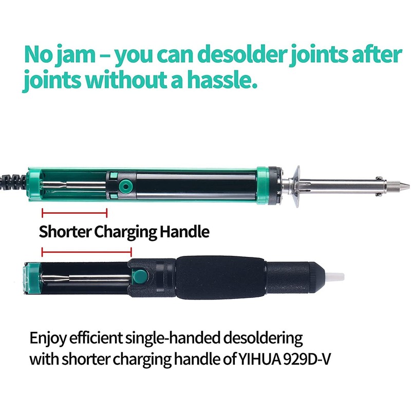 - This 929D-V desoldering iron kit integrates soldering iron and desoldering pump, you can enjoy the single-handed and continuous desoldering with its short charging handle to rid the hassle of changing grip positions. If you are looking to purchase a desoldering tool that can handle the desoldering jobs of through-hole components and removing excess solder (solder bridges) without jamming up, this is an great choice.
