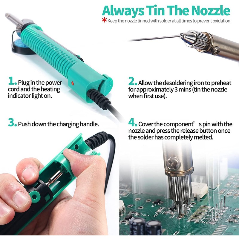- This is a plug-n-play desoldering iron. Plug in the power plug, allow the desoldering iron to preheat for approximately 3 minutes, and you are ready to go. YIHUA exclusive heating system combined with a strong desoldering pump ensures you experience uninterrupted desoldering.