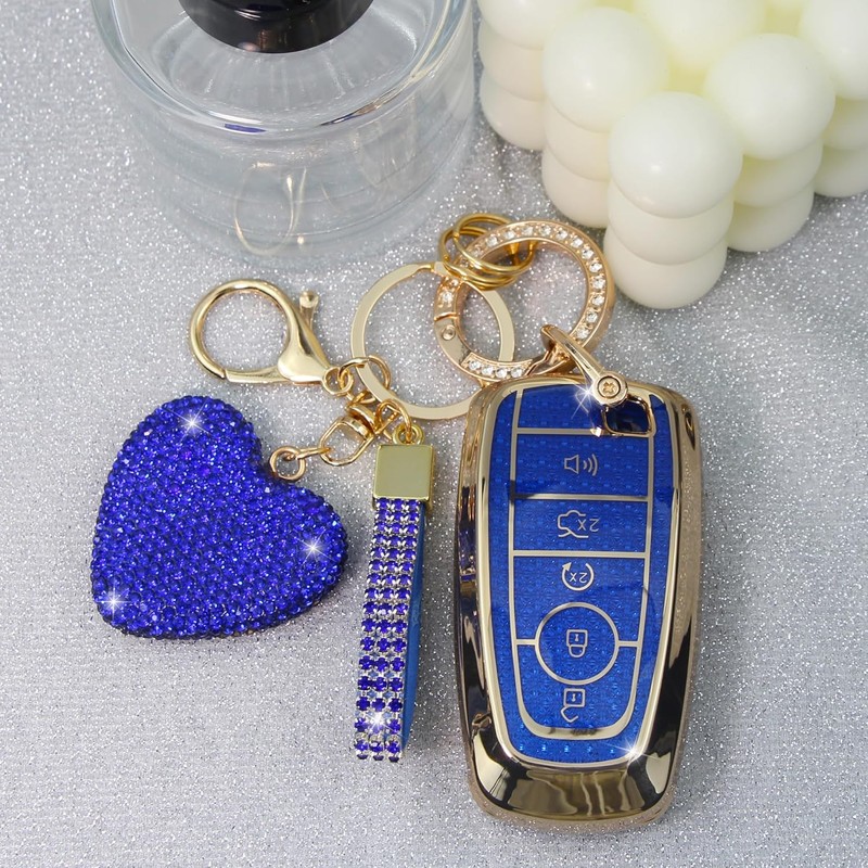 YIKECASE Key Fob Cover with Diamond Keychain for Women, Car Key Holder Compatible with Ford Explorer Fusion Edge Expedition F150 F250 F350 F450 F550 Maverick Mustang, 5 Buttons (Blue-Heart)
