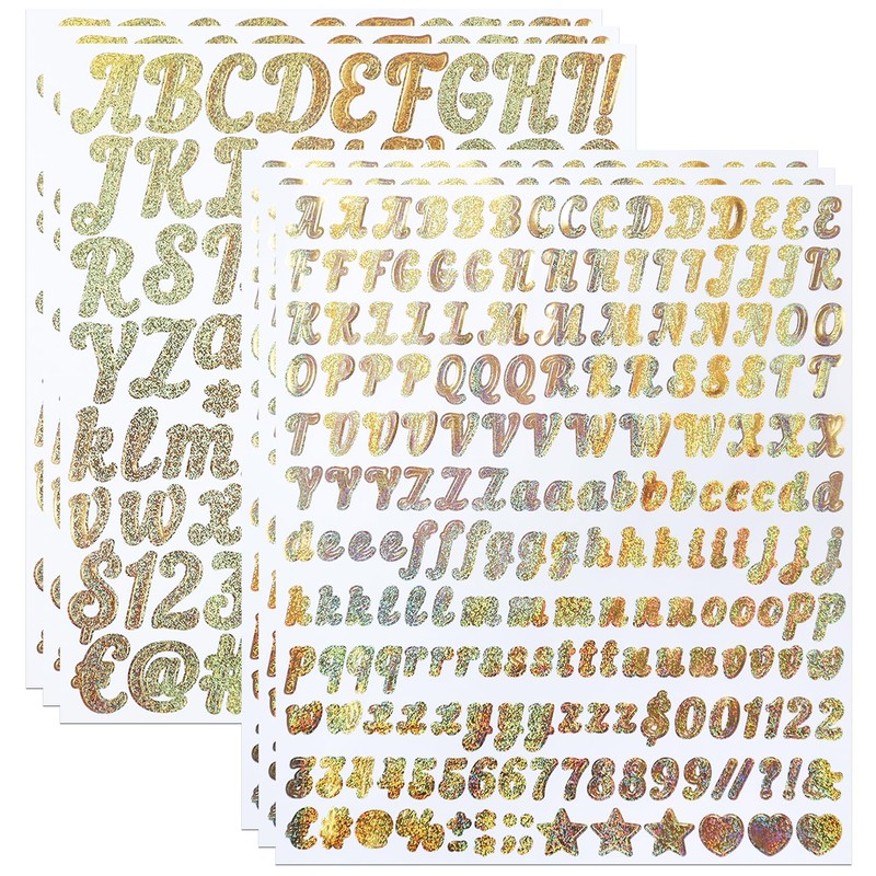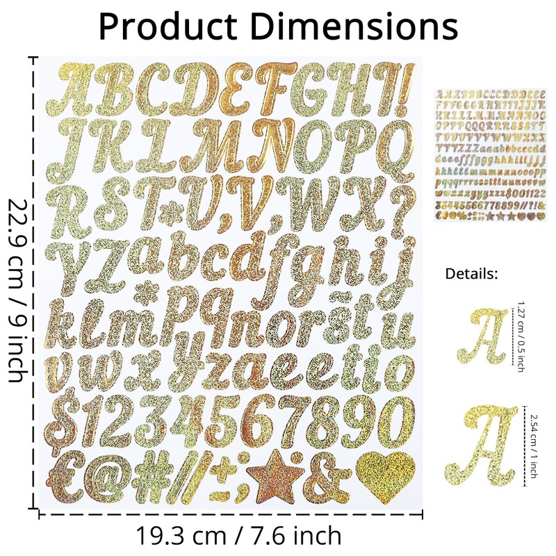 - Package: The set includes 6 gold-colored sheets, with 3 sheets containing 0.5-inch alphabet and number stickers and the remaining 3 sheets featuring 1-inch alphabet and number stickers. Each sheet includes uppercase letters, lowercase letters, numbers, and symbols.