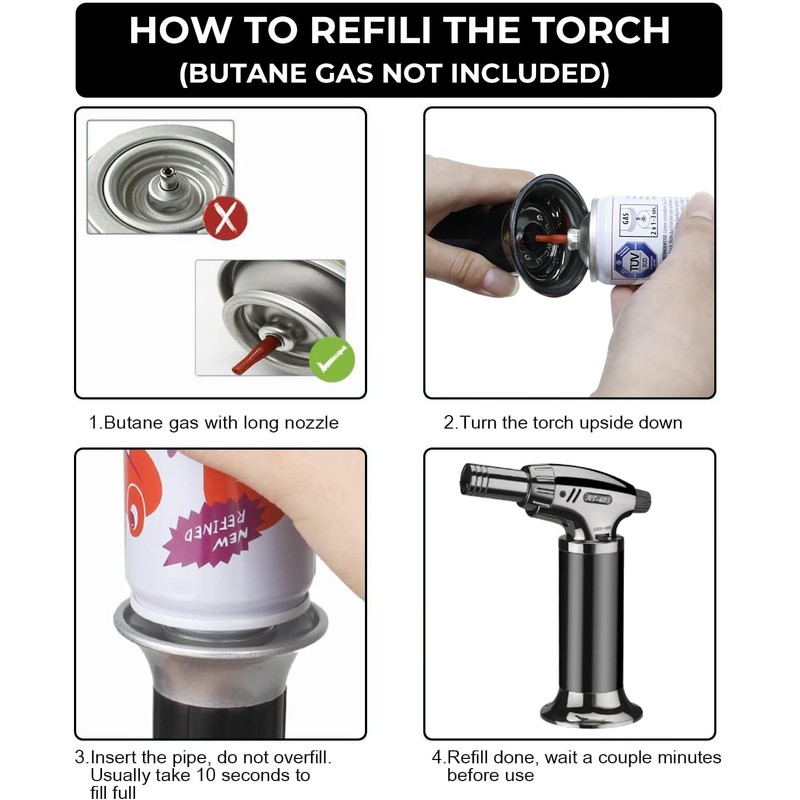 - 🔥 Refillable and Easy to Operate — Refill the kitchen torch with a butane canister with a long spout nozzle. Please note that butane gas is not included. Simply slide the security lock to open, light up with Piezo Ignition Technology.
