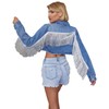 - Feature:Cropped jean jacket with fringe.Two pockets on chest,fringe design in back and sleeve,turn-down collar,single breasted,crop Jacket