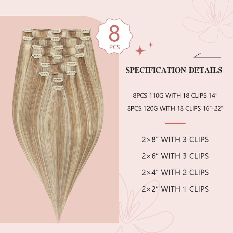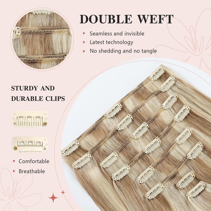 - Hair material: 100% real human hair, 10A quality, easy to install, no tangles, no hair loss, silky and soft, silicon-assisted clips, does not hide or hurt your hair, and it blends perfectly with your hair.