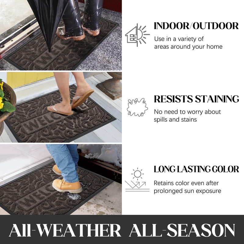- 【Capture Dirt and Moisture】: Yimobra front door mat outdoor with "Welcome" pattern grooves and sturdy heavy-duty design, forming a detention dam extending in all directions, helping to capture dirt, dust, gravel, mud, sand, grass or other messy debris and prevent them from entering Indoor; The surface of floor mat beautifully woven polyester fabric absorbs moisture, and the Sturdy oblique natural rubber edge will not accumulate water in rainy and snowy days, keeping your home dry and clean
