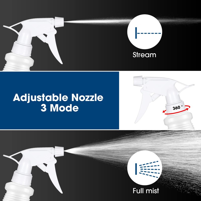 - Adjustable Nozzles: the 16 oz refillable spray bottles have 3 different modes of adjustable nozzles, you can easily adjust easily switch from mist, stream or to off; The trigger can be pulled and squeezed easily, which can give you comfortable grip and reduce finger fatigue