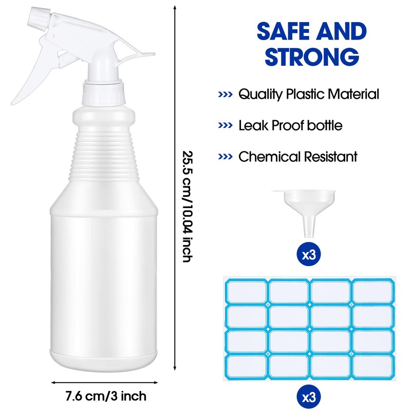 - Package Contains: you will receive 18 pieces of 16 oz white empty spray bottles (total come with 3 sheets of label stickers to distinguish all purpose and 3 pieces of plastic funnels); Practical combinations and rich content can meet your use and replacement needs, and you can also share it with your family and friends