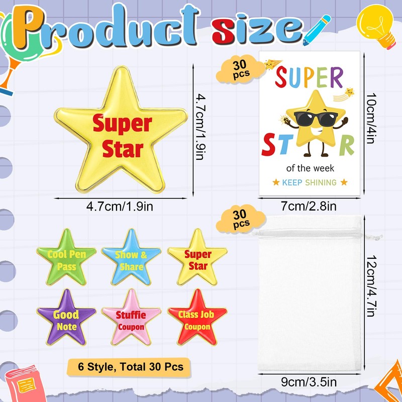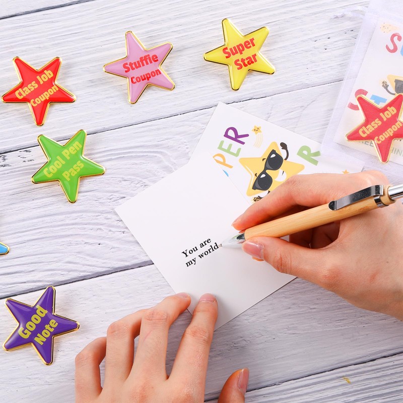 - Five Pointed Star Style: pentagram pins are printed with " Job Coupon", "True Love", "Super Star", "Cool Pen Pass", "Good Notes", "Show Share" and "Stuffie coupon", and the student reward cards are printed with motivational word, cute and interesting