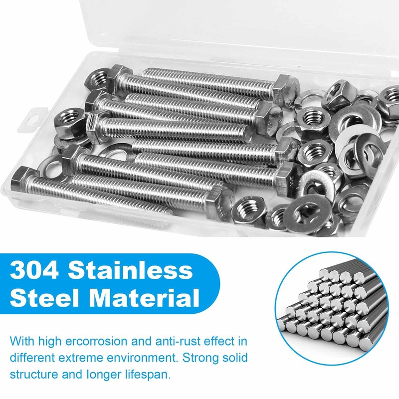 - Package Included: 20 PCS Hex Bolts, 20 PCS Hex Nuts, 20 PCS Flat Washers and 20 PCS Spring Lock Washers.
