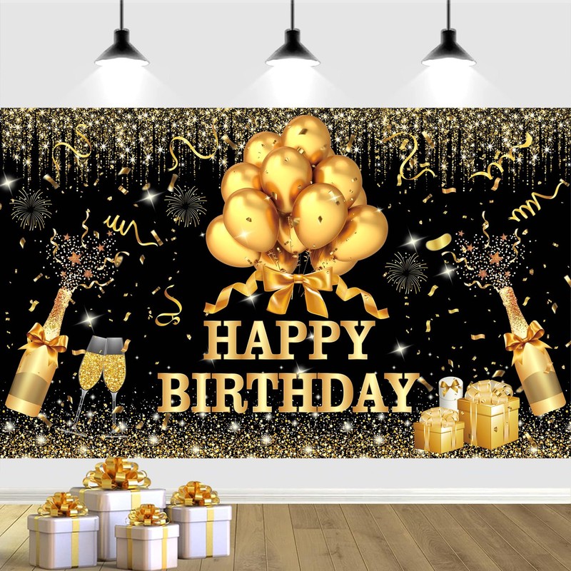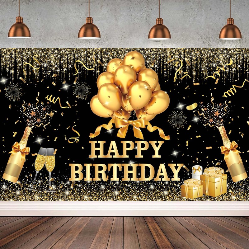 - 【Warm Tips】Washable black golden happy birthday sign backdrop banner decorations, the first wash will fade slightly. Due to folded shipping, it may cause creases. Please iron the back surface with electronic iron with the lowest heat. If you have any questions about the product, please feel free to contact us, we will provide you with a satisfactory solution.