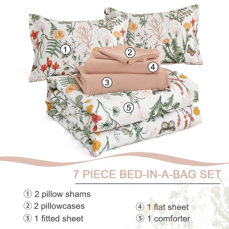 • 7 Pieces Bed in a Bag: White botanical comforter king set includes 1 comforter 104''x90'', 1 flat sheet 108''x102'', 1 fitted sheet 78''x80''+14'', 2 pillowcase 20''x40'', 2 pillow shams 20''x36''. Pillow insert is not included. It may come wrinkled due to vacuum sealed bag, put it in the sun and tap gently for fluffy