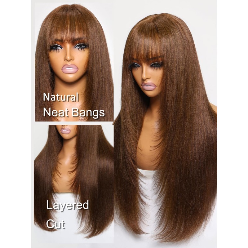 YIROO Yaki Straight Human Hair Wig with Bangs Chocotlate Brown Layer Cut Glueless Wigs for Women HD Transparent 4x2 Lace Closure Dark Brown Hair 20Inch