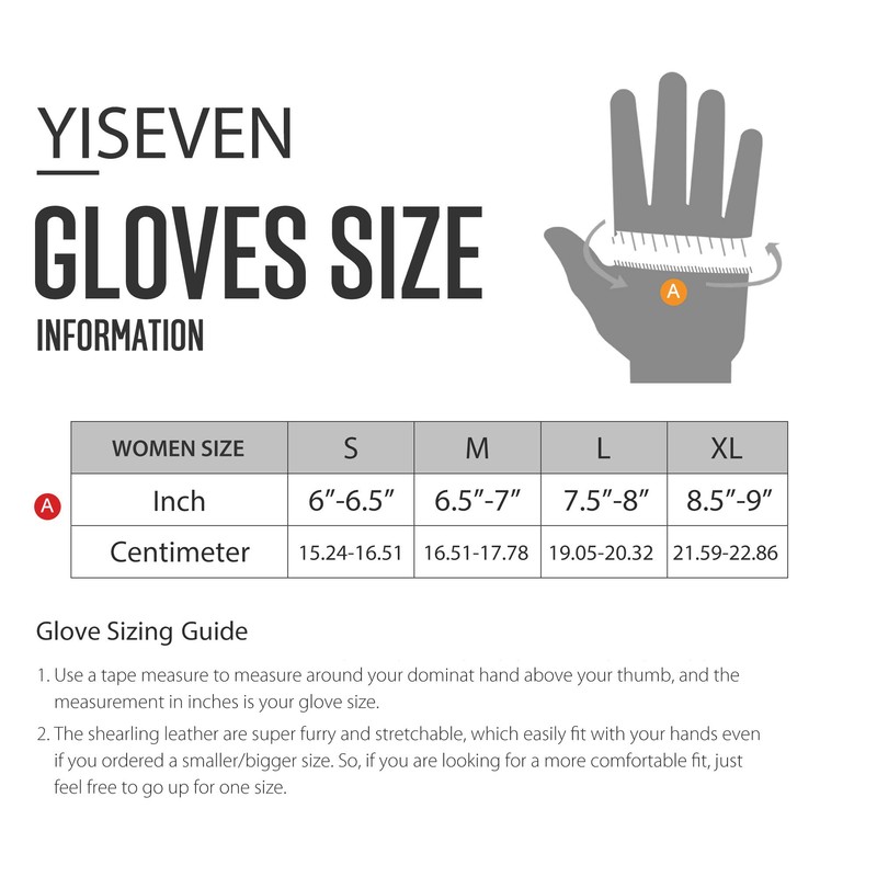 - FULL RANGE OF GLOVE SIZES - To determine your size, you basically measure around your dominant hand, excluding your thumb. The measurement in inches is your glove size. If you measure in centimeters, you have to divide the measurement by 2.54 to determine your glove size. *(The shearling leather are super furry and stretchable, which easily fit with your hands even if you ordered a smaller/bigger size. So, if you are looking for a more comfortable fit, just feel free to go up for one size.)