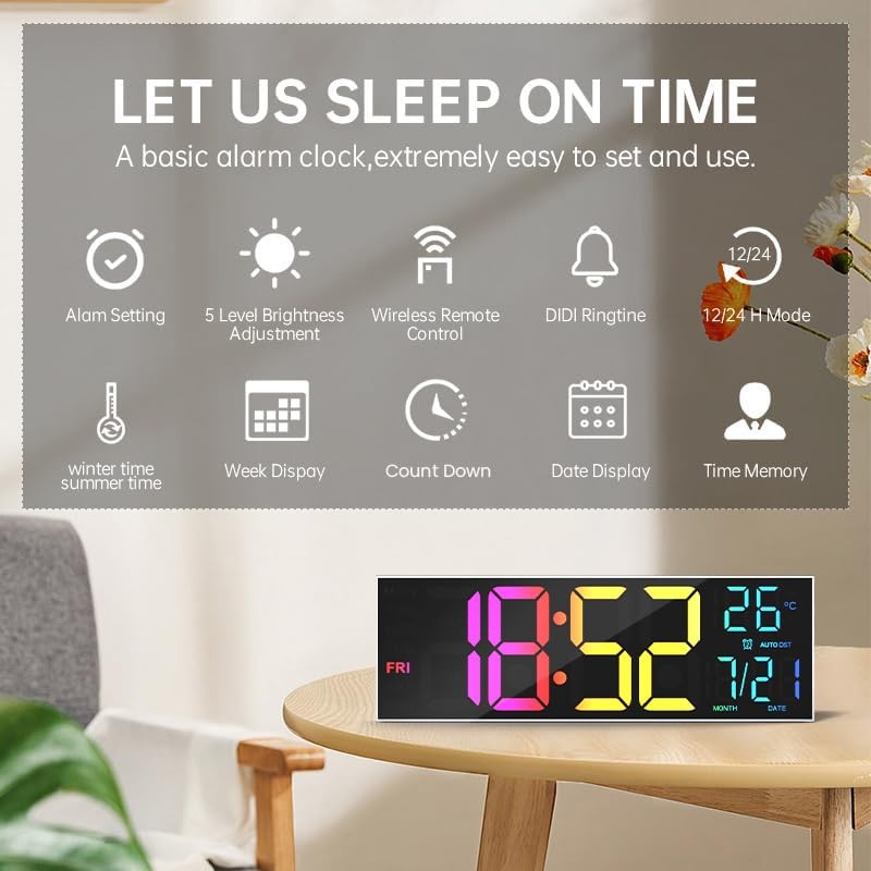 - DYNAMIC RGB COLORFUL COLORS-16.2-inch alarm clock with high-definition display and 5 different single segment color modes for letters, plus 3 different multi color modes. A convenient remote control allows you to change colors, so you can have a color or custom color alternation.