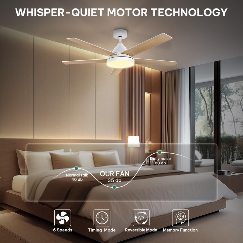 - Superior Airflow, Silent Comfort: Engineered with 5 optimized blades and a brushless DC motor, this 52-inch white ceiling fan delivers a powerful 3502 CFM airflow (20% stronger than others) while operating whisper-quiet, suitable for bedrooms or open living spaces