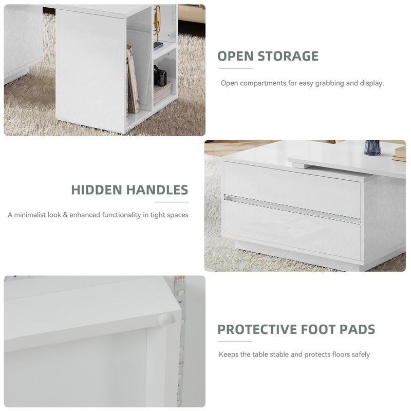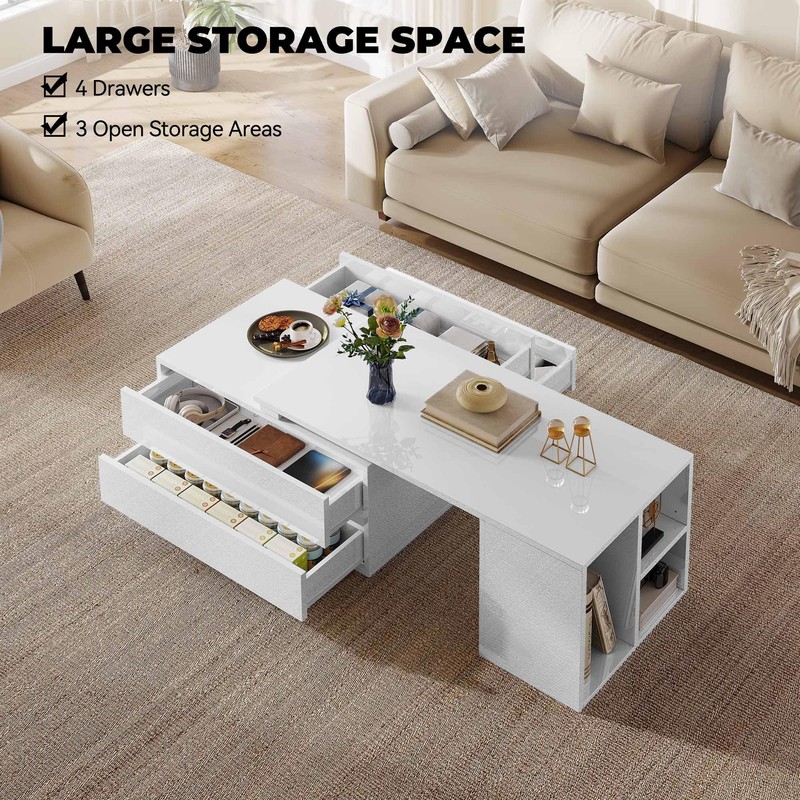 - Coffee Table with Ample Storage: Living room coffee tables featuring 4 quiet drawers on smooth white slide rails and a side open compartment, this modern coffee table keeps your space tidy, ideal for storing books, remotes, or decor within easy reach and neatly organized.