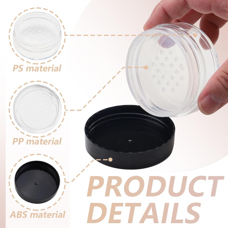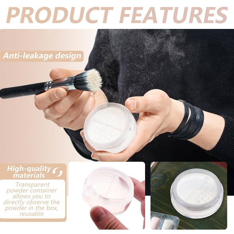 • Leak-proof Design: Designed with a no-leak screw lid and rotatable sifter, our makeup powder containers ensure your favorite powders stay secure. Simply rotate the sieve layer to lock your powder, then cover the lid to prevent spills or messes