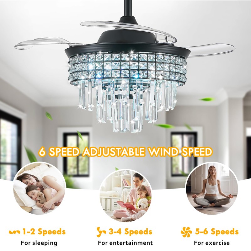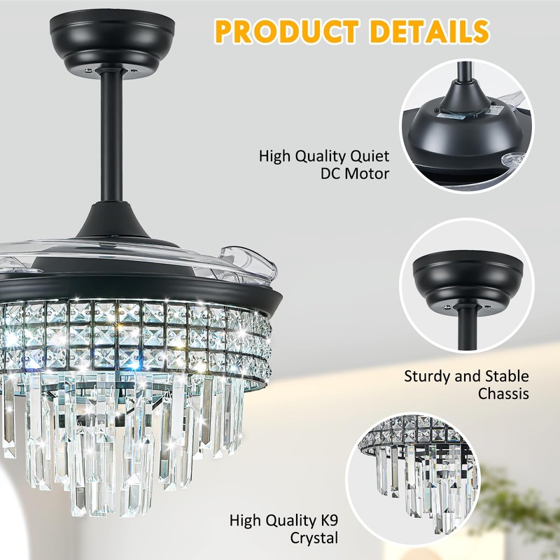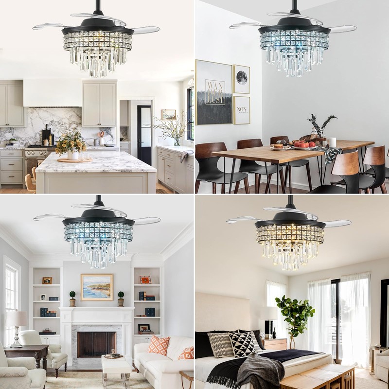- 【Invisible Aesthetics】36" retractable blades shrink to 15" when closed, transforms into crystal chandelier with transparent PC blades for decor harmony