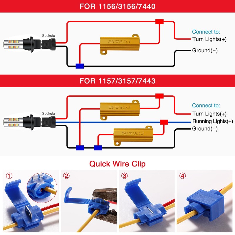 • EASY INSTALLATION Simply connect one wire of the resistor to the earth and the other to the plus wire. Please attach the included quick wire clip so you don't have to cut off existing wires. Attention - The load resistor gets very hot when operating, please mount it on a metal surface, NOT plastic. Do not touch directly by hand.