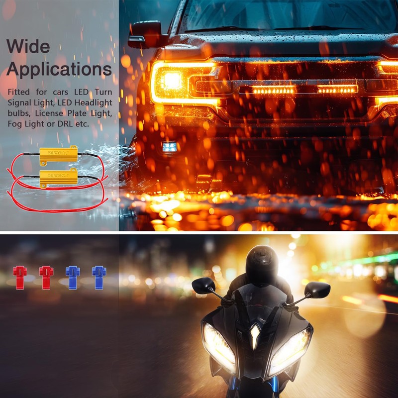 • Practical function: fix light errors. 50 W 8 Ohm load resistors can fix your LED light problems, e.g. B. Turn signal error, no flashing or showing a blown bulb, excessive flashing of LED turn signal or license plate light bulbs, OBC error messages of other LED bulbs.