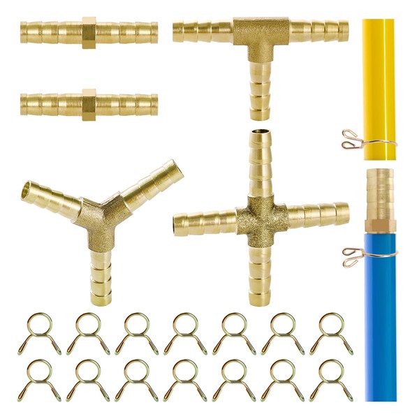 YIXISI 5 PCS 6mm 2/3/4 Way Fuel Hose Barbed Connector, Brass Joiner Adapter With 14 PCS Clamps, for Air, Water, Gas Oil
