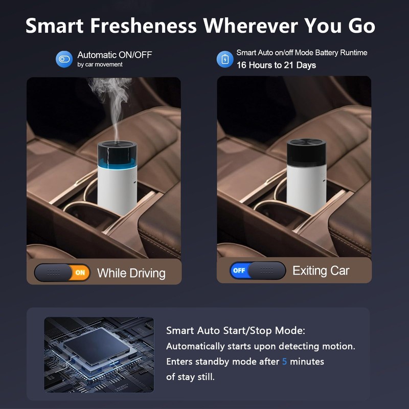 - 【Innovative Car Auto Mode & Waterless Safety】:Function as a car diffuser: Auto-stops misting 5min after engine cut-off, restarting when driving. Automatic shut-off engages at low water for safety